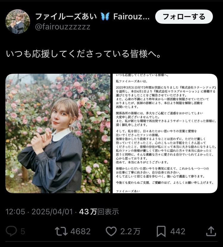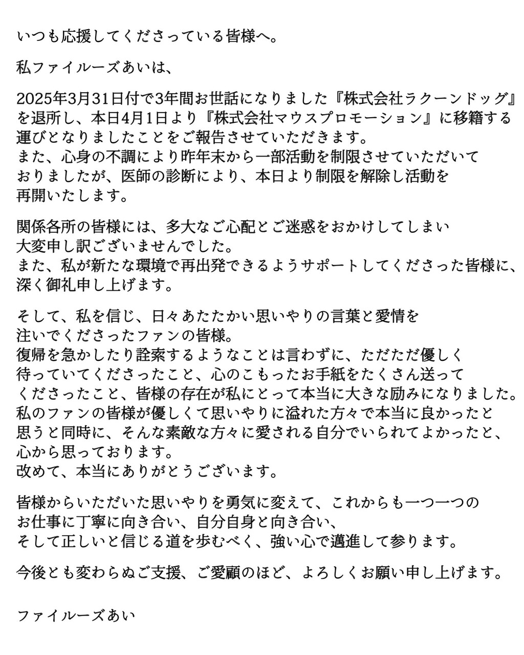 声優・ファイルーズあいが活動制限を解除し、マウスプロモーションに移籍したと発表。昨年末からPTSD治療のため活動制限していたが、4月1日より本格復帰へ。