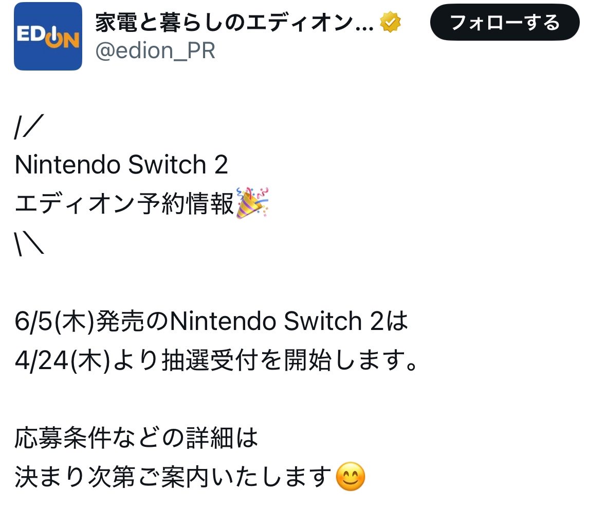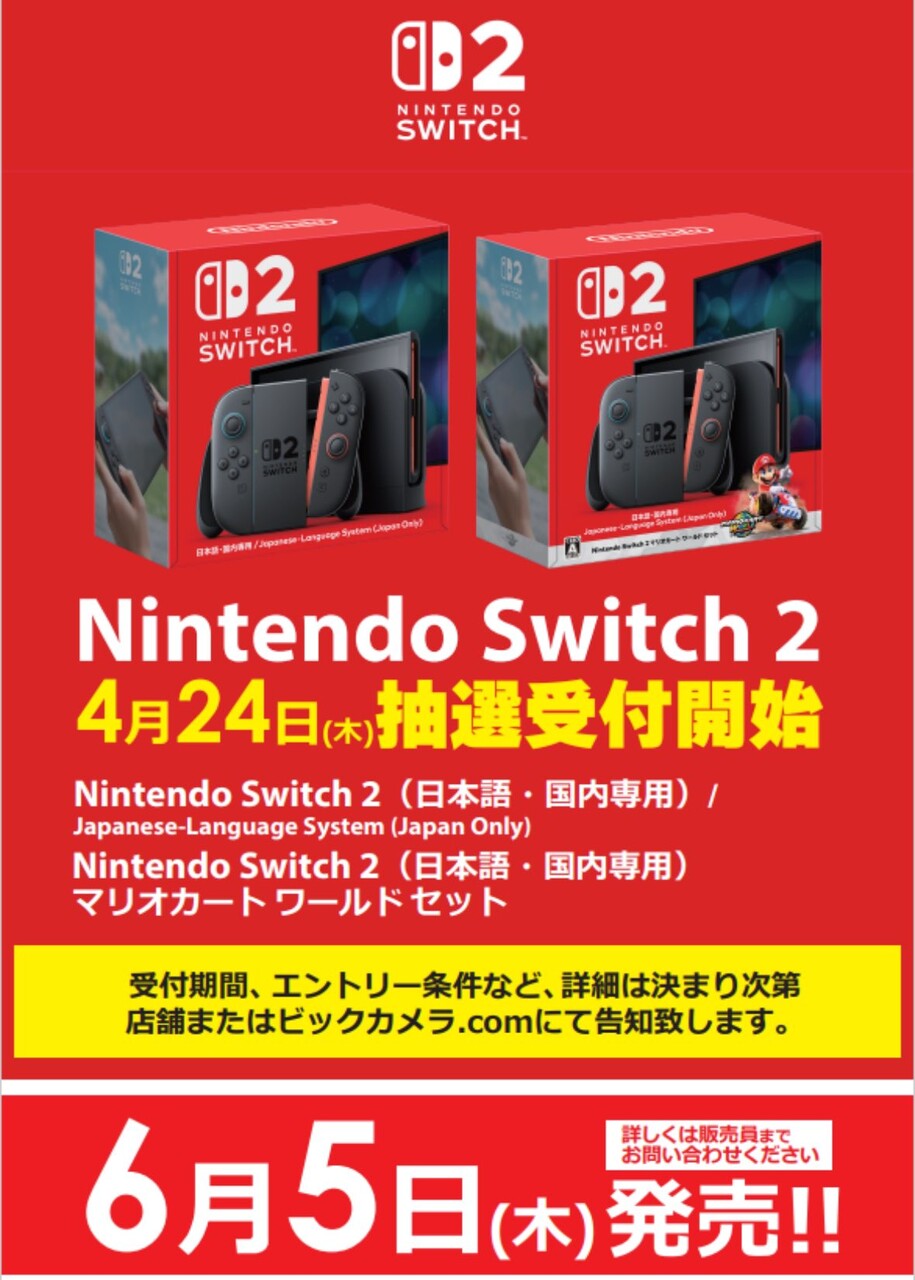 【朗報】Switch2、ビックカメラとEDIONで4/24から抽選受付開始!!!!