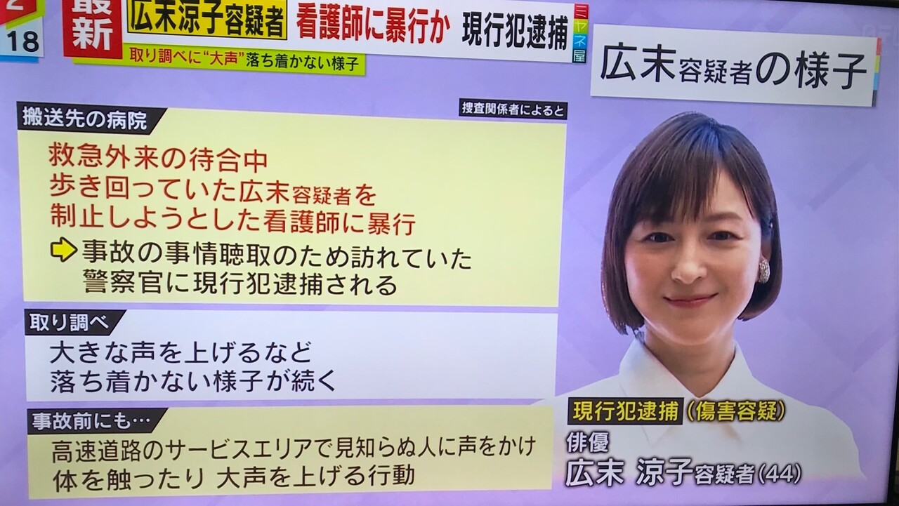 交通事故で搬送された広末涼子容疑者が、病院で歩き回り看護師に暴行。制止されると蹴ったり引っ掻いたりして現行犯逮捕された。