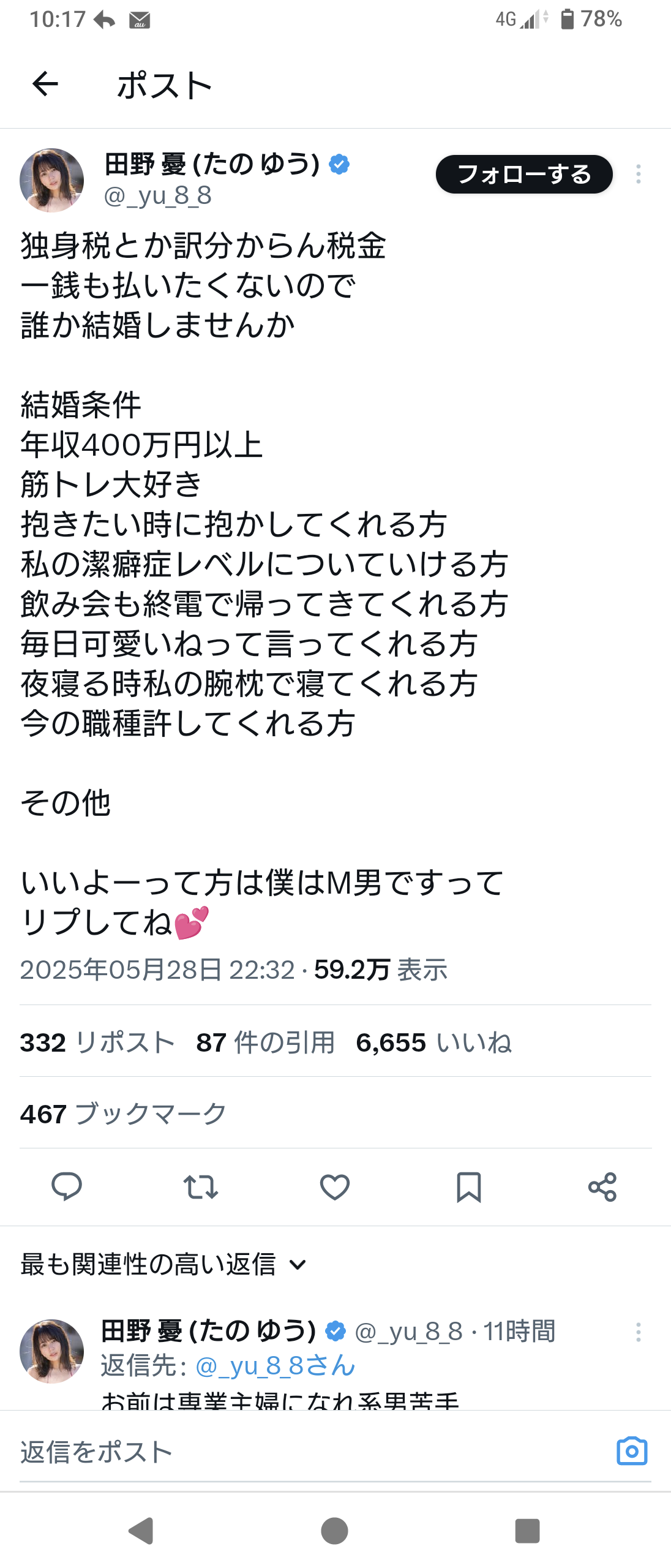 田野憂が「年収400万・筋肉好き限定」で結婚相手を募集。潔癖だけどAV出演中というギャップが話題に。