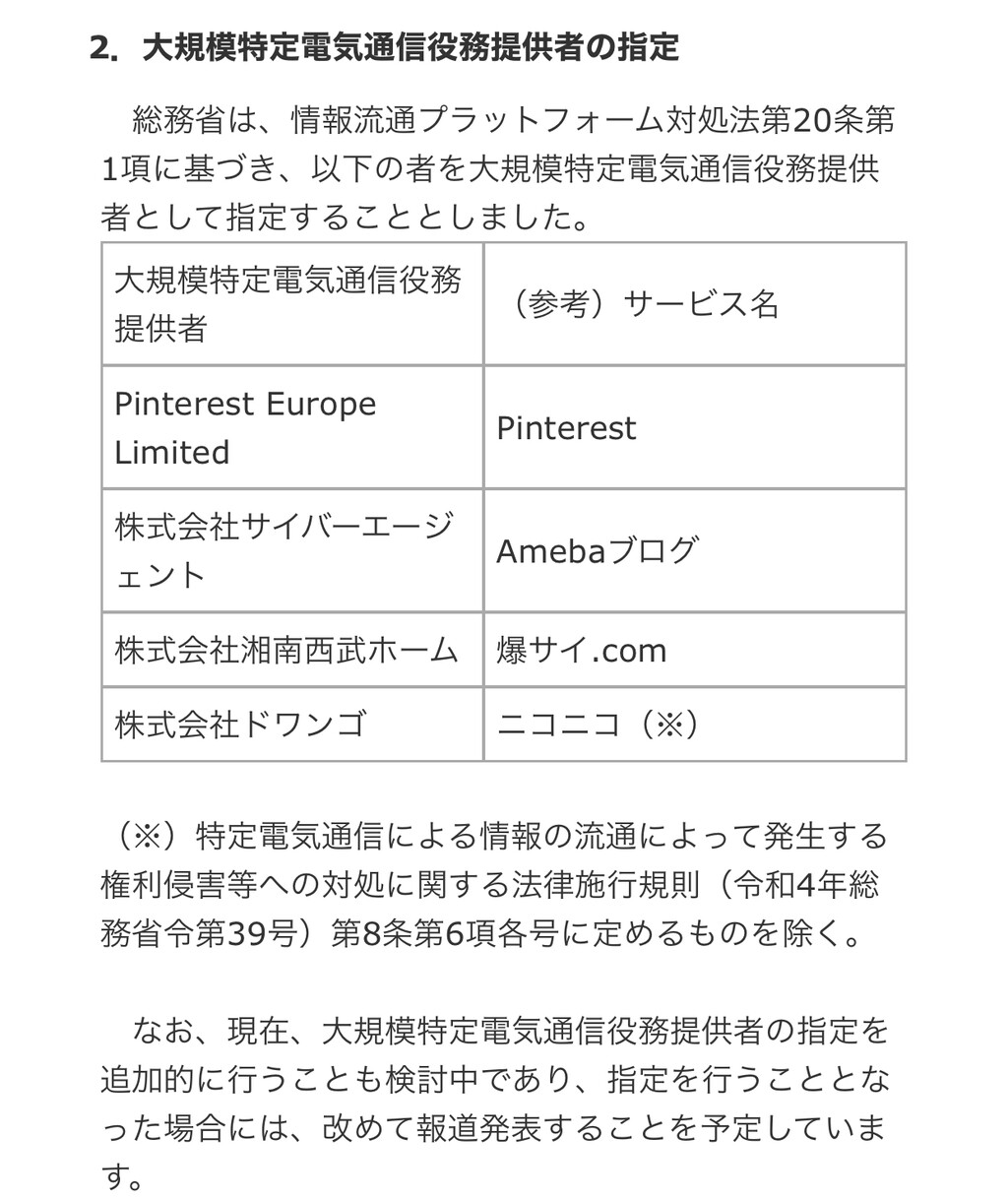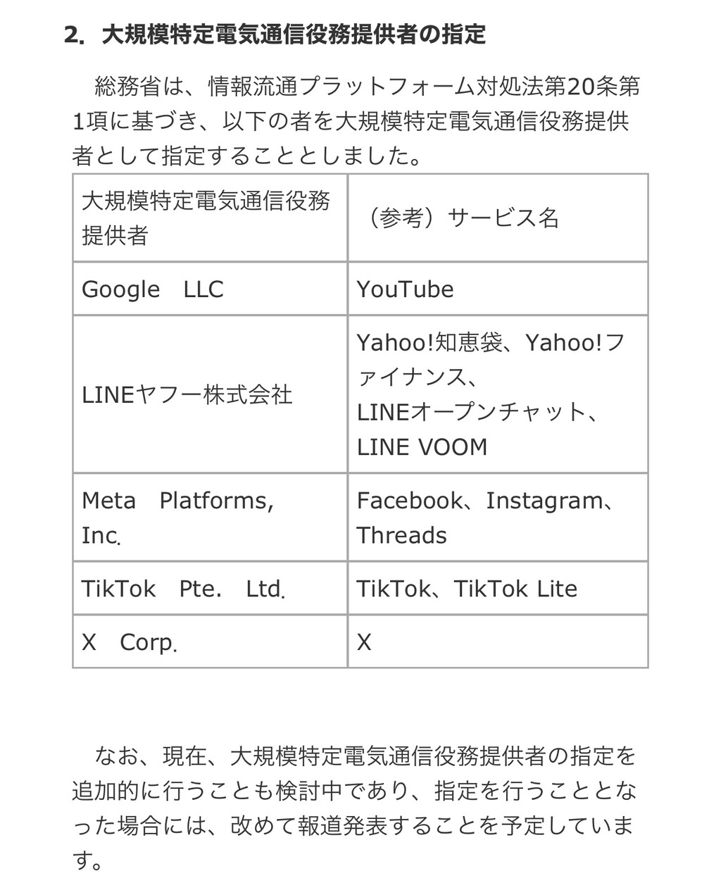 総務省は30日、情報流通プラットフォーム対処法第20条第1項に基づき、4社を「大規模特定電気通信役務提供者」として指定したことを発表した。