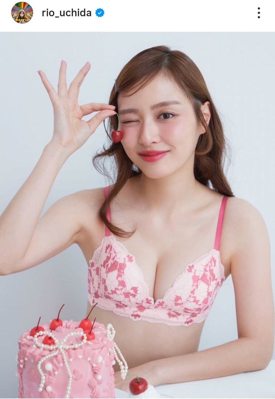 内田は「親友にこの写真が1番好きって言われたので載せます笑」と記し、ピンクの華やかな柄のブラジャー姿で、チェリーを手にした笑顔の写真をアップ。「みんなはどの下着が好きだった?」と呼びかけた。