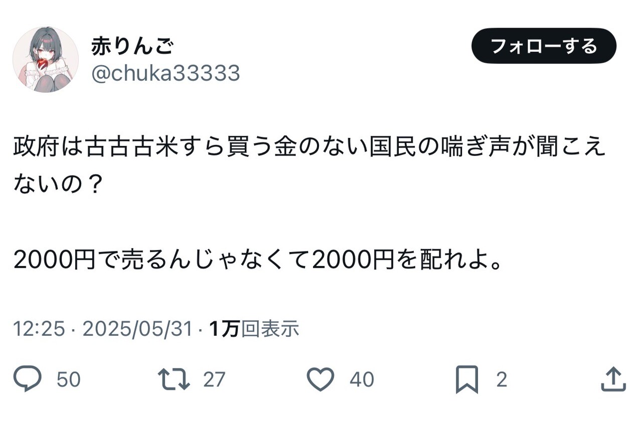 古米が高騰しすぎて「喘ぎ声が出た」と投稿した人物が話題に。「政府に声を届けよう」などコメントもカオス。