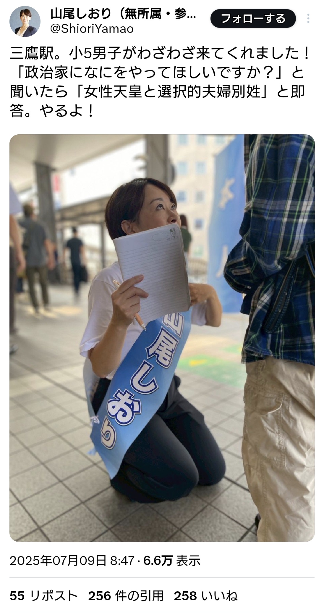 — 山尾しおり(無所属・参院選東京選挙区) (@ShioriYamao) July 8, 2025