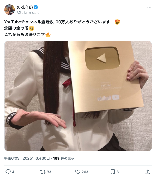 16歳の人気YouTuber「tuki.」が登録者100万人を突破し、YouTubeから金の盾を受け取る快挙を達成。