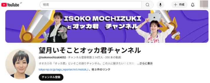 そのチャンネル名は「望月いそことオッカ君チャンネル」。概要欄を見てみると、開設は20年3月となっているが、本格的に動き出したのは今年に入ってからのようだ。週に数本のペースで配信し、これまでの配信総数は351本(7月15日現在)、登録者数は2万1400人(同)に達している。視聴回数も着々と伸びており、元フジテレビアナウンサー・阿部知代氏のイタンビュー動画は2万回以上再生。収益化はクリアしているとみられる。