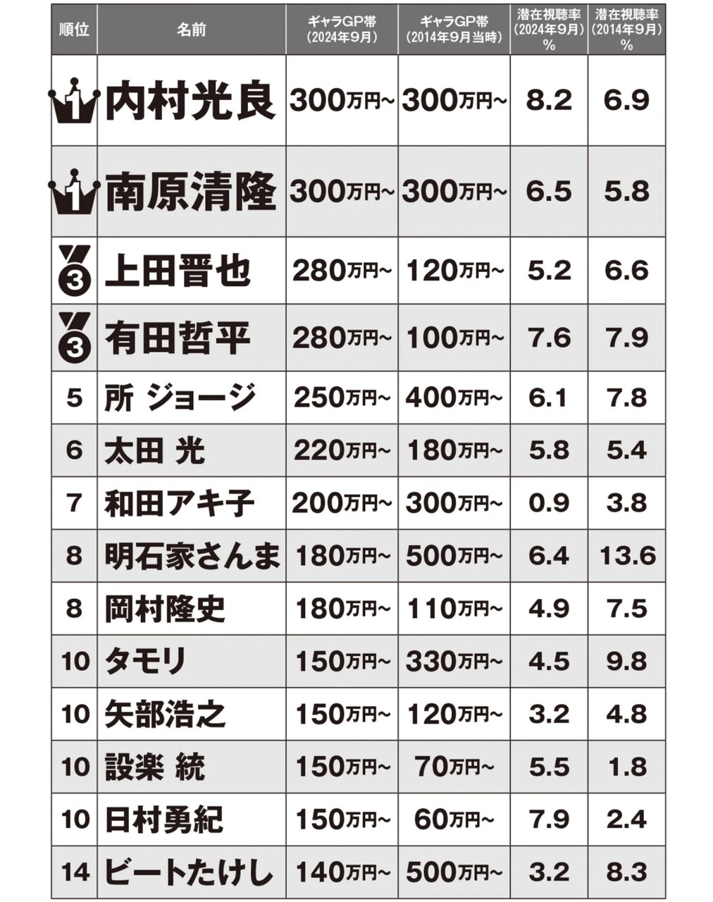 他のコンビが両方リストに載っている中で、爆笑問題の田中が圏外なのが面白い
