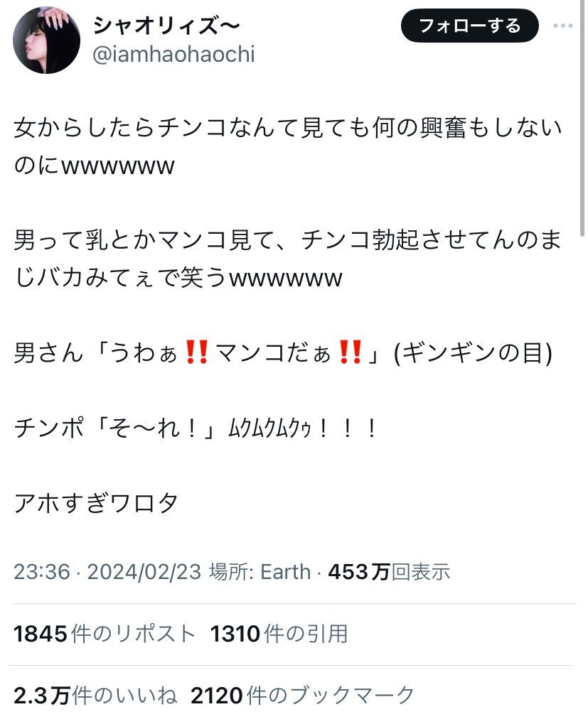 ギャルが「男って乳やマンコ見て勃起すんのウケるw」と爆笑投稿。5chで共感と自虐コメントが殺到。