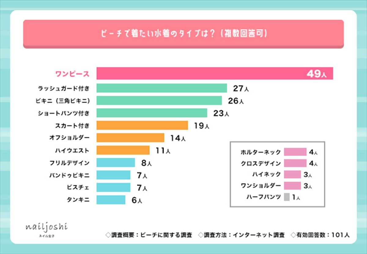 3位は「ビキニ(三角ビキニ)」で26人。2位は「ラッシュガード付き」で、27人でした。1位は「ワンピース」で49人という結果でした。