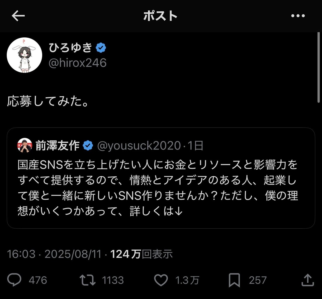 実業家のひろゆき氏が11日、Xを更新。前澤友作氏が募集した国産SNS立ち上げに「応募してみた」とつぶやいた。
