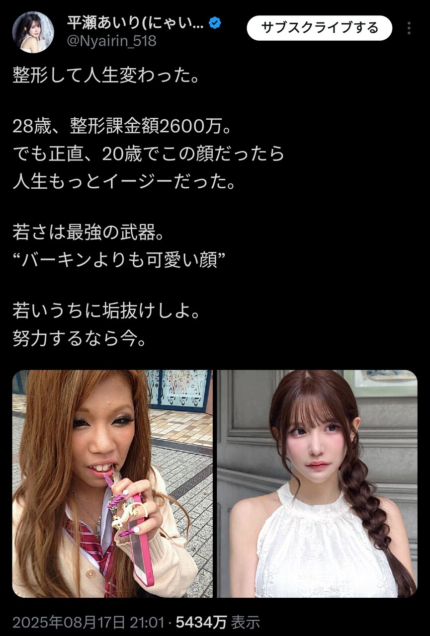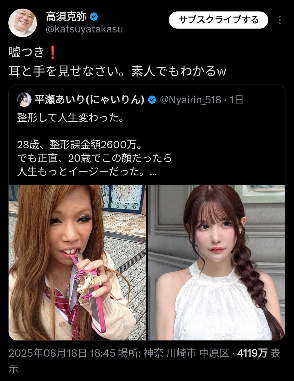 2800万円の整形で別人級の変貌!高須院長の発言や歯並び論争まで、ネット民が費用対効果を議論。