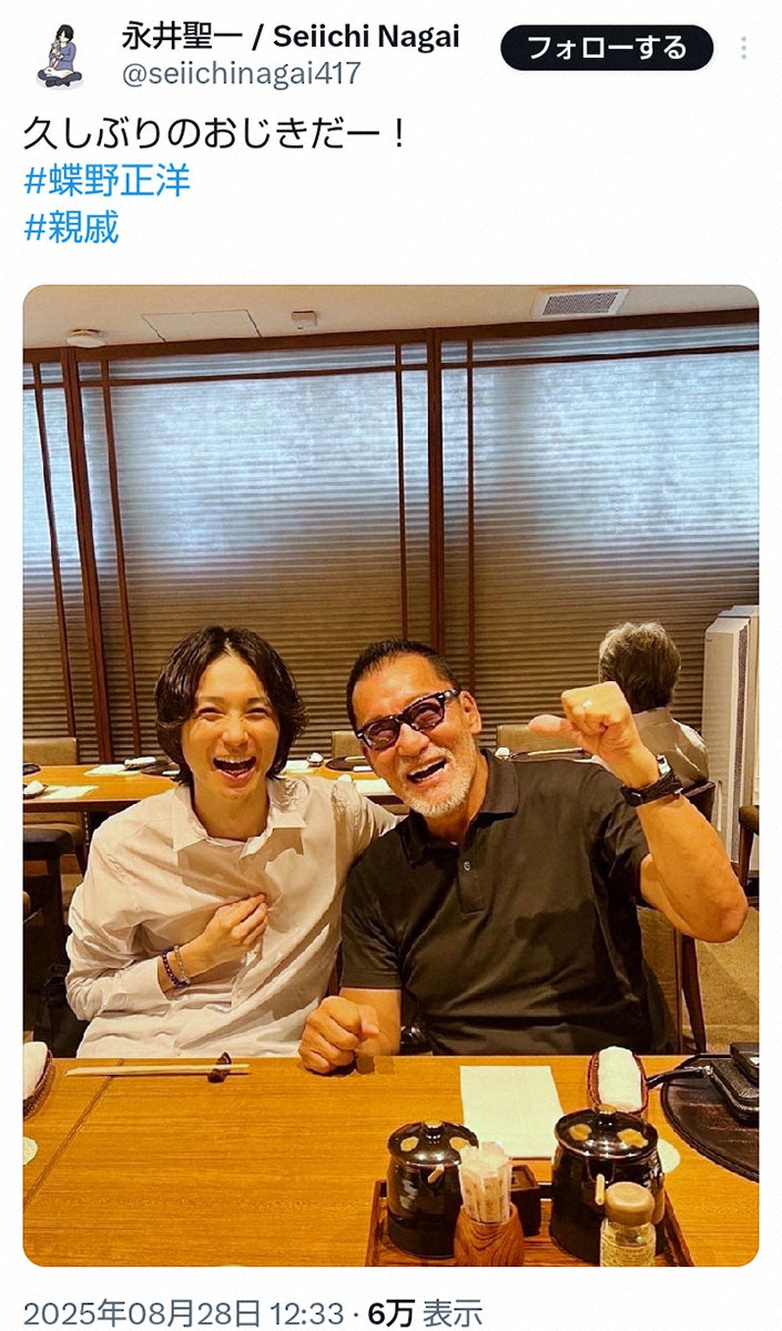 バンド「相対性理論」のギタリスト・永井聖一(42)が29日までに自身のインスタグラムを更新。おじがプロレスラーの蝶野正洋(61)であると明かした。