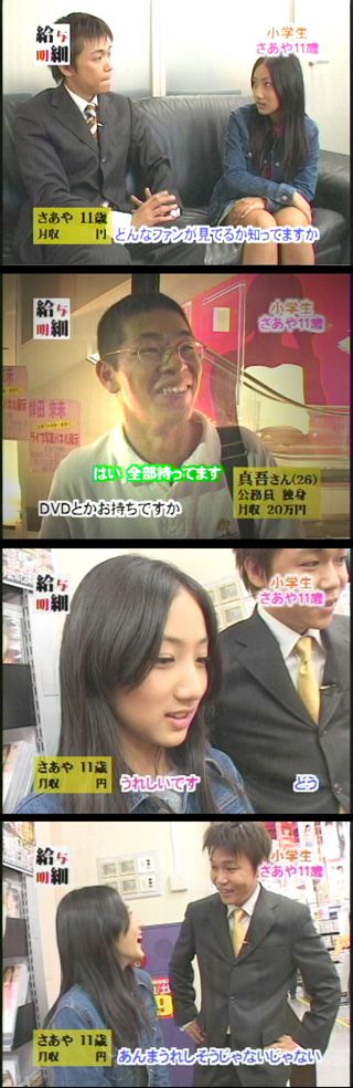 当時小学生の紗綾たん、レポーターに、自分の商品がどんな客に買われているのか知ってるか!?などと追及されてかわいそうでつた。また自分のDVDが売られてる場所に紗綾たんは連れて行かれ、その怪しいお店でキモい客たちを目の当たりにして、自分の客は「マニア」だと答えさせられておりまつた。まだ小学生の紗綾たん、自分がキモくてエロいヲタにオカズにされていることを知らしめさせられて、可哀想でつた。可哀想、つまり、萌えでつた!ww