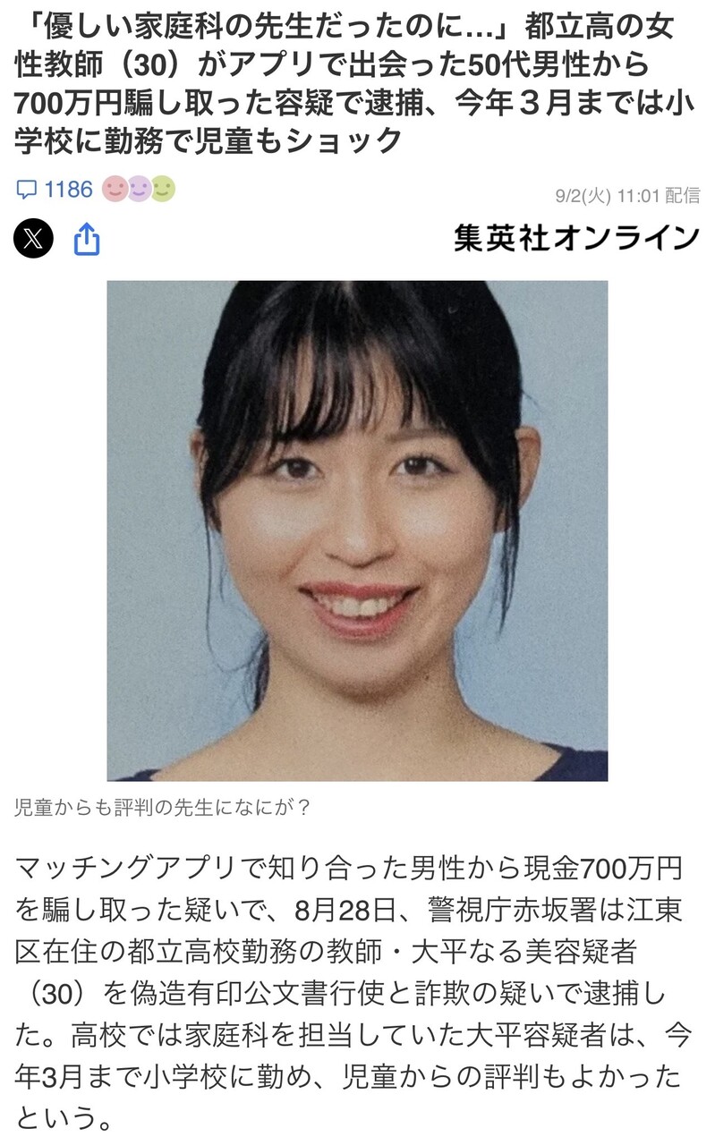 美人女教師がパパ活で700万円騙し取り逮捕。見た目は清楚、でも中身は詐欺師?ネットでは「エッッッ」の声多数。