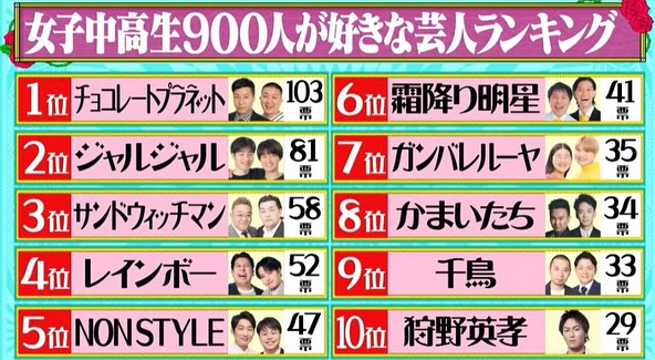 【画像】女子高生が選ぶ好きな芸人ランキング!!