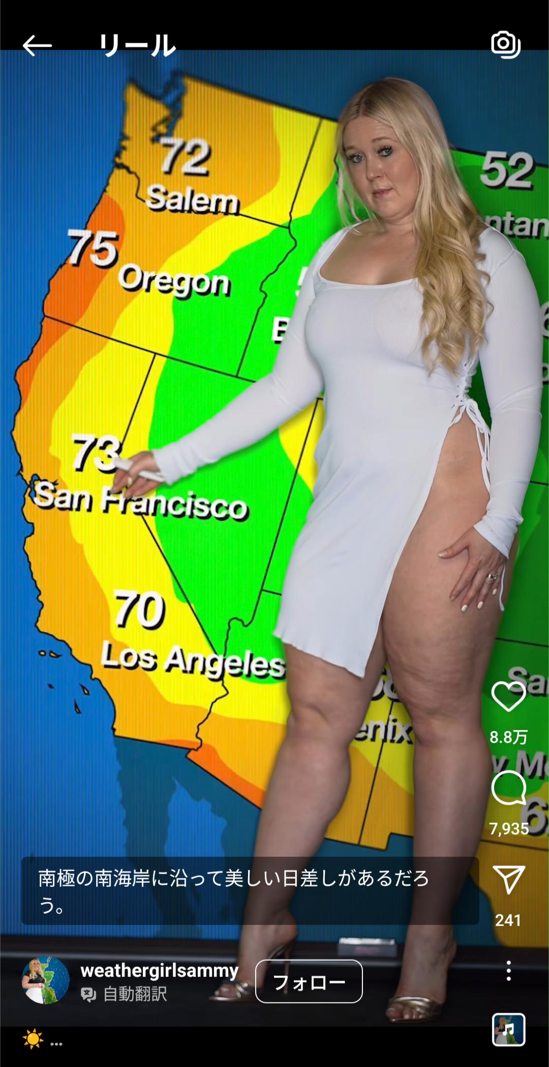 【画像】本番アメリカのウェザーニュースお姉さん、日本の2倍すごい