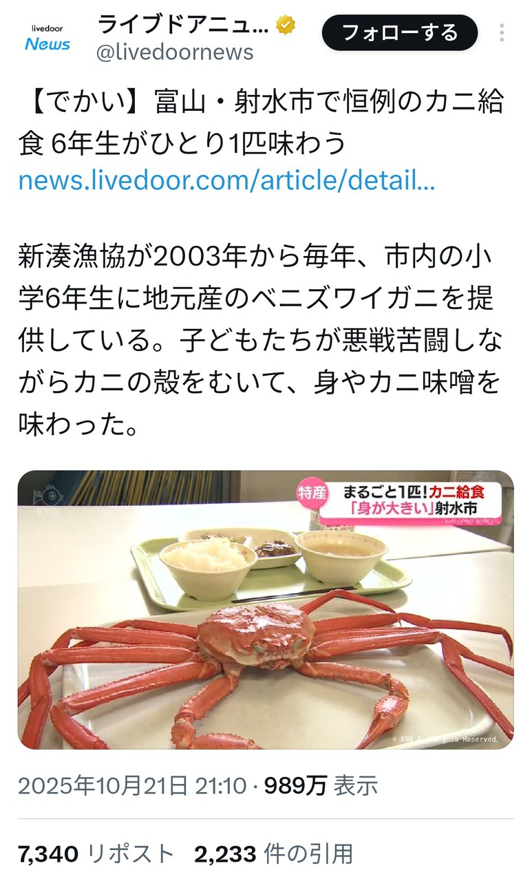 多分「カニアレルギーの子に配慮しろ!」って苦情も来てるだろうけど気にしないでほしいね