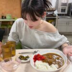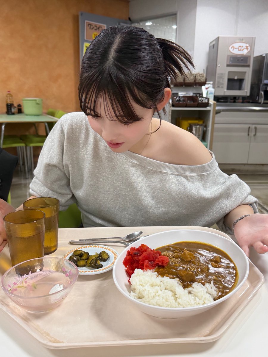 【画像】JCさん、肩出しして学食みたいなカレーを食べてしまう…