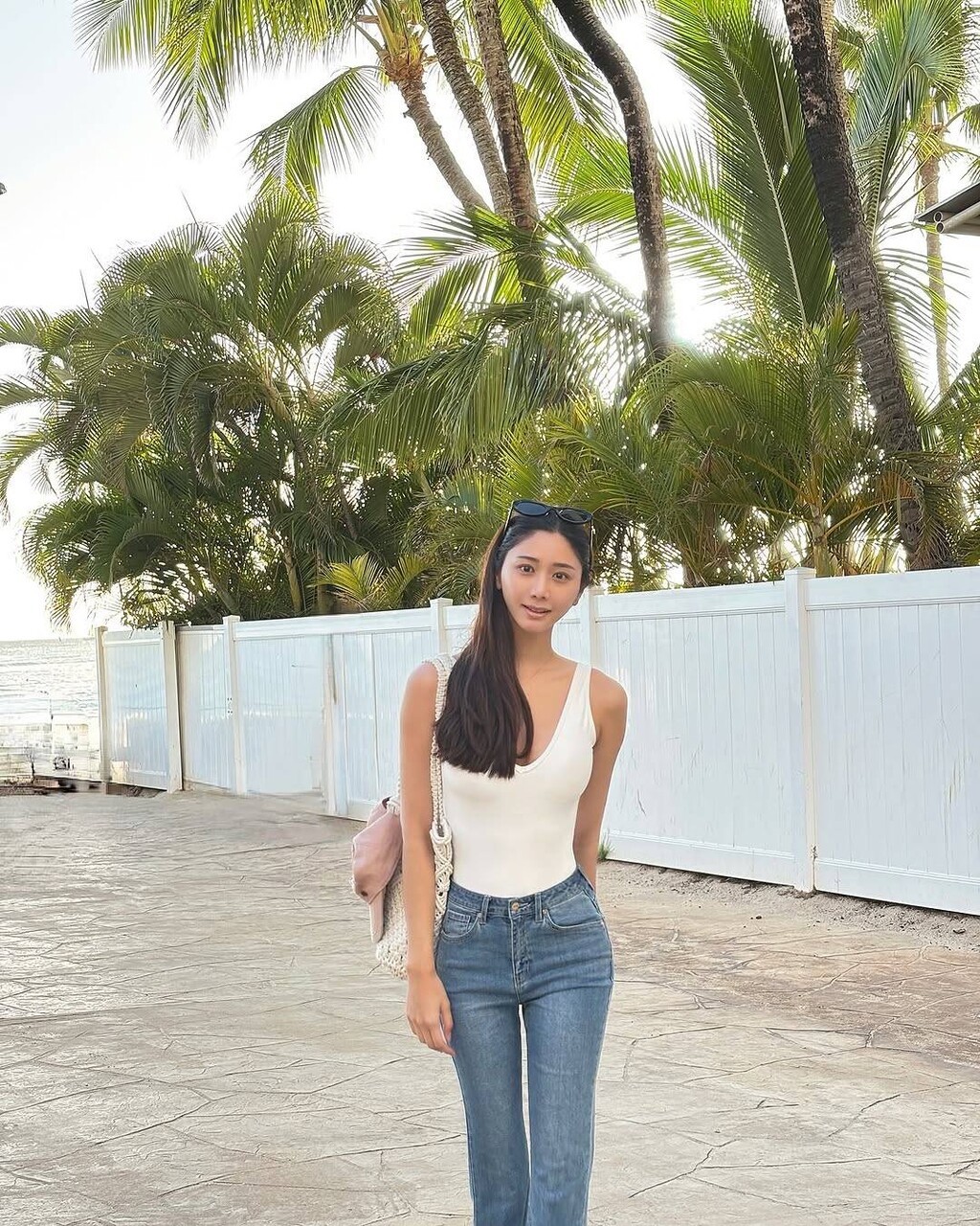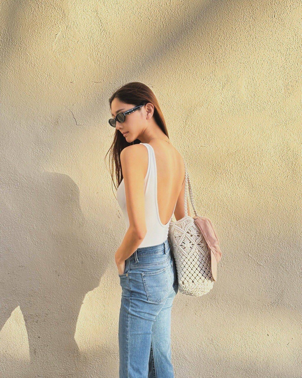 「背中フェチ??」として公開したのは、白のタンクトップにデニムというラフな出で立ち。ただ背中がパックリあいており、9頭身とも称される驚異のスタイルが惜しげもなく披露されている。