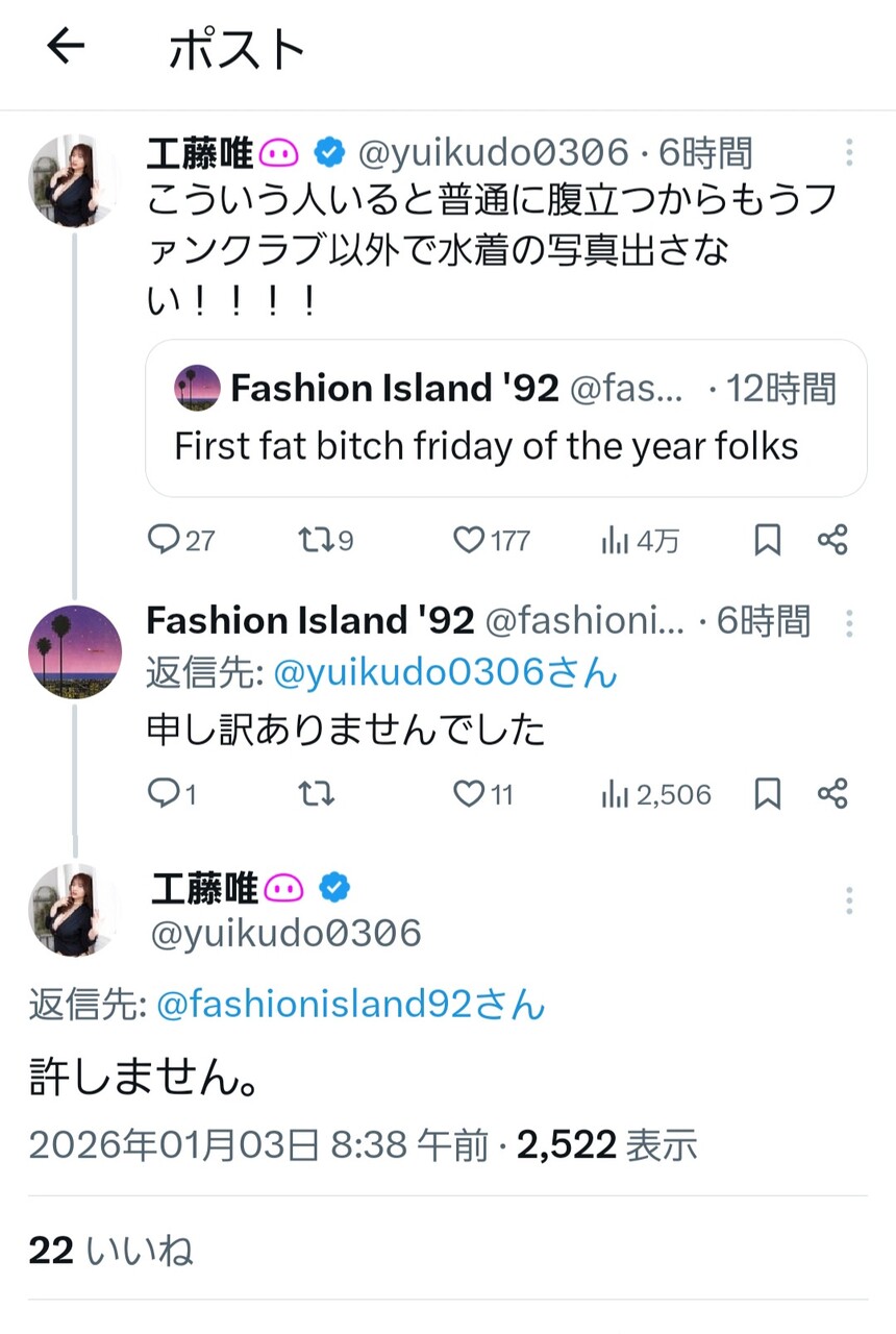 普通にデブのビッチだよ日本の感覚が狂ってるだけで世界に自分の身体を晒すんだぞ?これをビッチ呼ばわりしないで誰をビッチ呼ばわりするんだよ