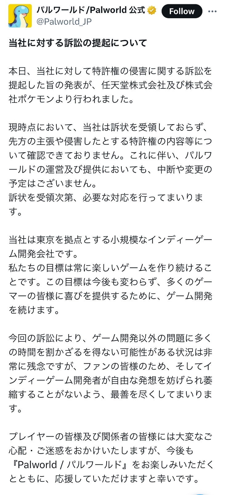 パルワールド開発会社さん、任天堂に訴えられるも「業界のために最善を尽くす!」と戦う姿勢