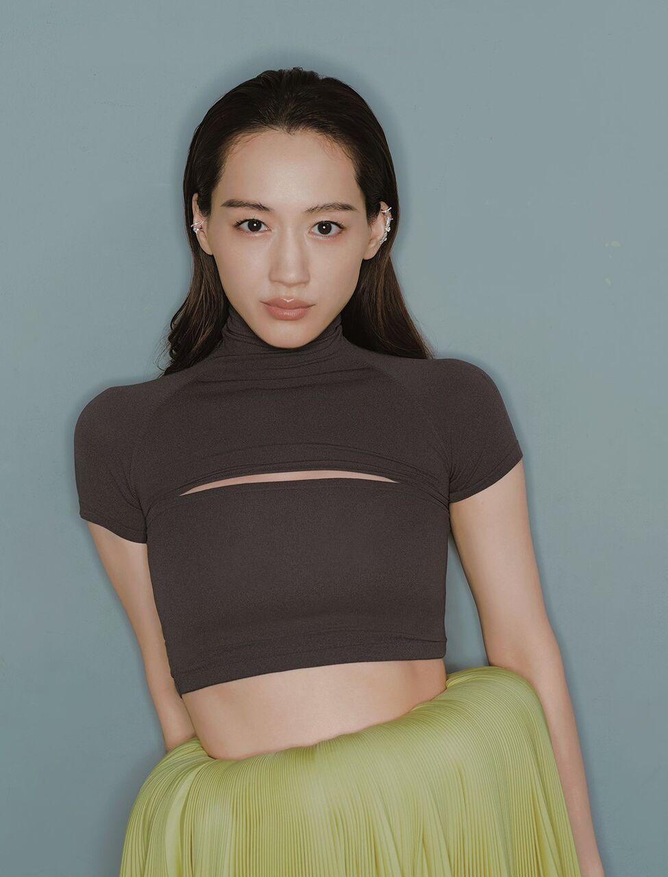 ショート丈のニット姿。胸元が開いたデザインもセクシーだ。注目は腹筋で、筋も見える。