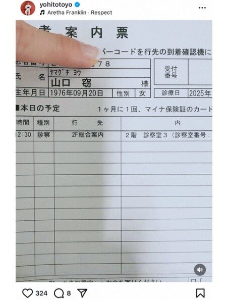 一青は「久しぶりに間違われました(笑」(原文ママ)とし病院での患者案内票の写真をアップ。名前の欄には「山口窃」と書かれている。