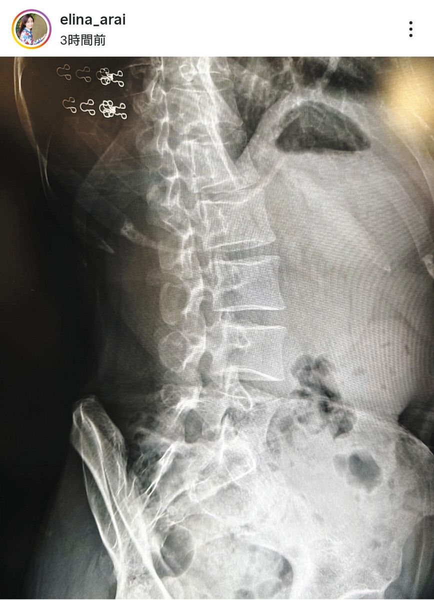 新井は「レントゲン写真って、レイヤーがいくつもある感じでなんだか綺麗~…というのは個人の感想でしょうか?笑」と腰回りのレントゲン写真を投稿した。