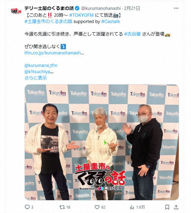 声優の古谷徹(71)が21日に更新されたYouTubeチャンネル「テリー土屋のくるまの話【公式】」にゲスト出演。その変貌ぶりに驚きの声が上がった。