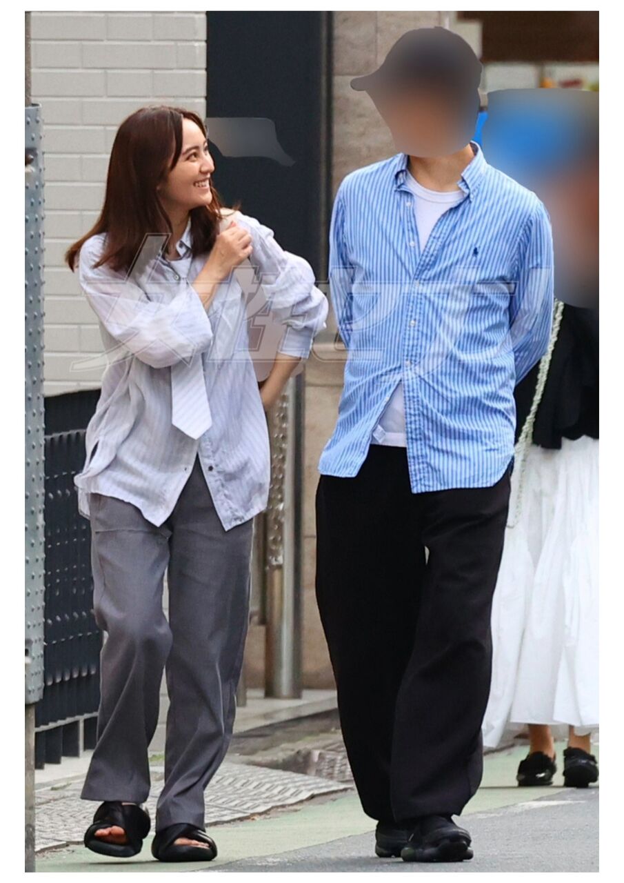 流行のネクタイ付きのシャツに、足元はサンダルというリラックスした姿の岡田の隣には、キャップを被った長身のイケメン男性。ストライプのシャツはお揃いだ。カフェを出ると、肩を寄せ合うふたりは時折目を合わせ、にこやかに語らいながら通りを行く。