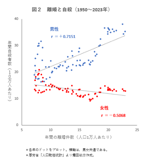 過去70年余りのデータだが、離婚と自殺の相関関係が男女で異なることが分かる。男性ではプラスなのに対し、女性ではマイナスだ。
