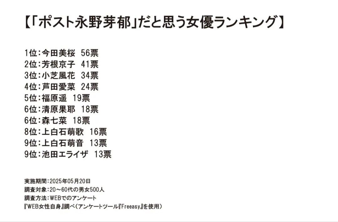 そこで本誌は、WEBアンケートツール「Freeasy」にて、20~60代の男女500人を対象に「『ポスト永野芽郁』だと思う女優」についてアンケート調査を実施した。