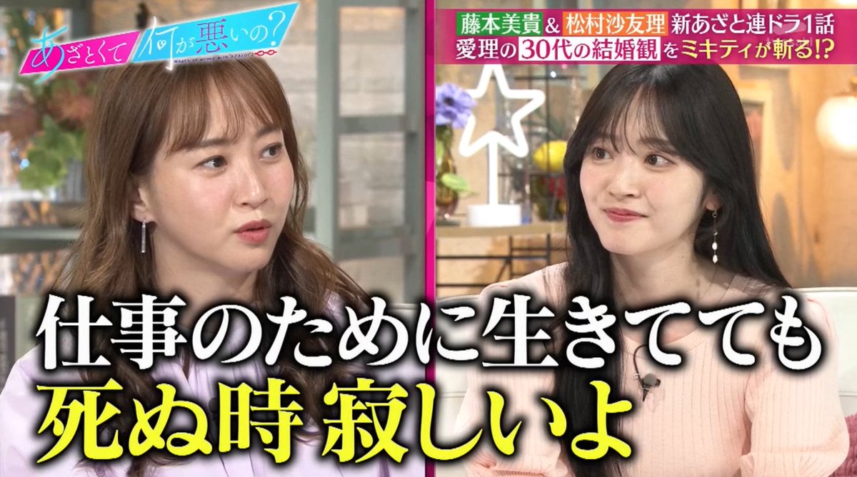 鈴木愛理の「仕事が楽しいから結婚は後回し」って発言、確かに共感する人多そうだけど、藤本美貴の「死ぬ時寂しいよ」は笑いに包んでるけど結構ズシンと来る一言。
