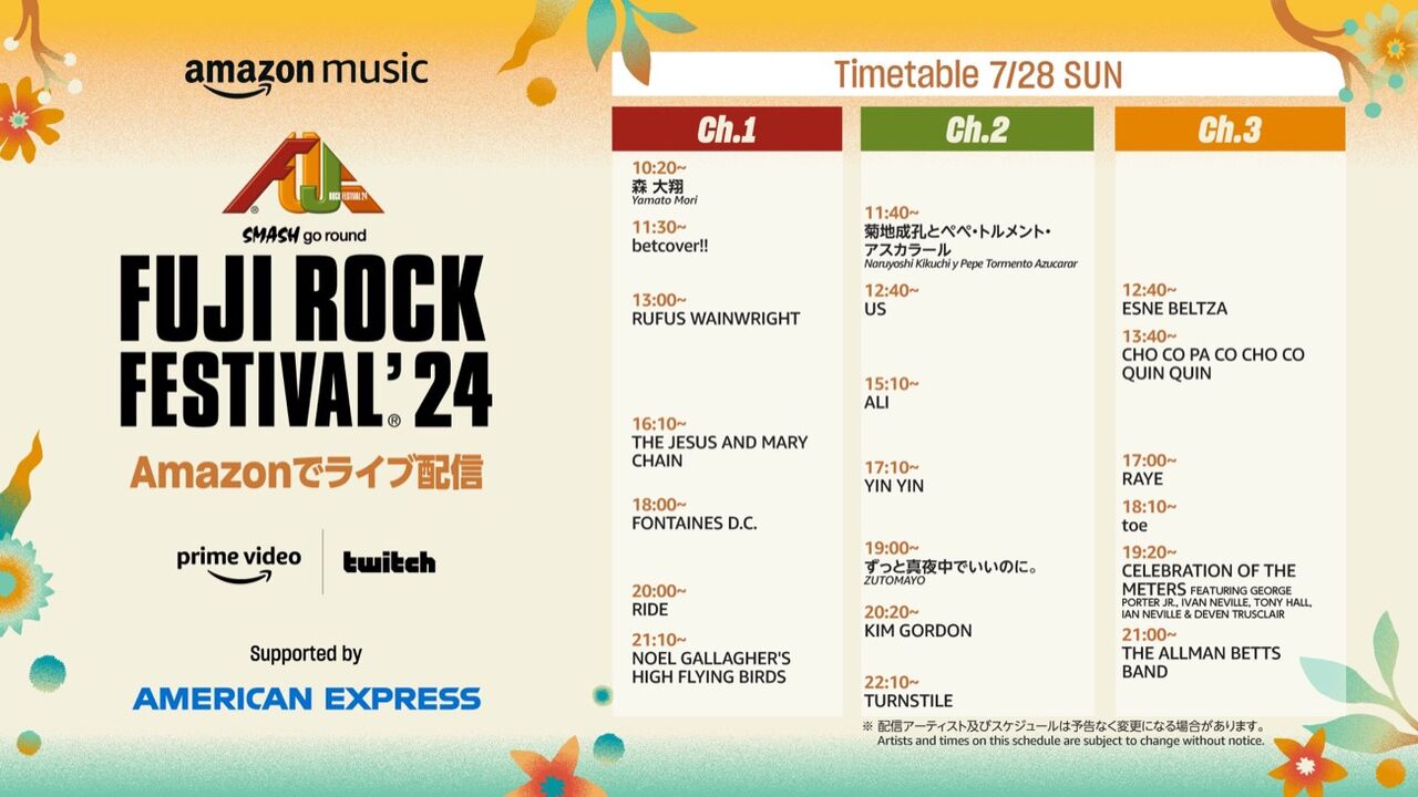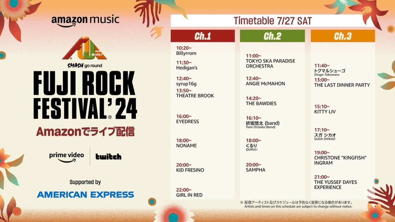 フジロック、生配信アーティスト&タイムテーブル公開 …配信するAmazon Musicが、配信アーティストのラインナップとタイムテーブルを公開した。Prime VideoとTwitchのAmazon Mu… (出典:オリコン) |