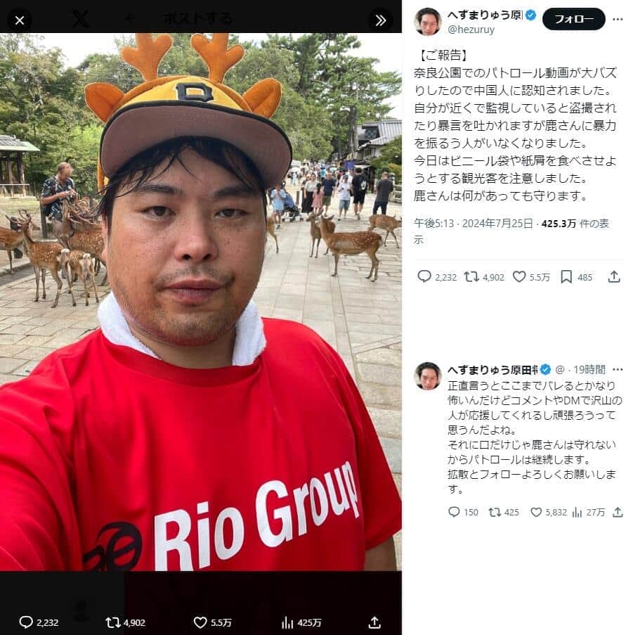 これを受け、へずまは24日に自身のXで「奈良公園の鹿に対し動物虐待をする海外観光客について厳重に注意します。現在、公園に二日間滞在していますが多数の危険人物を追っ払うことができました。奈良県警が動かないので自分が代わりにパトロールをします。危ないと思ったら私人逮捕もせざる終えなくなります。日本の宝は俺が守る」としていた。