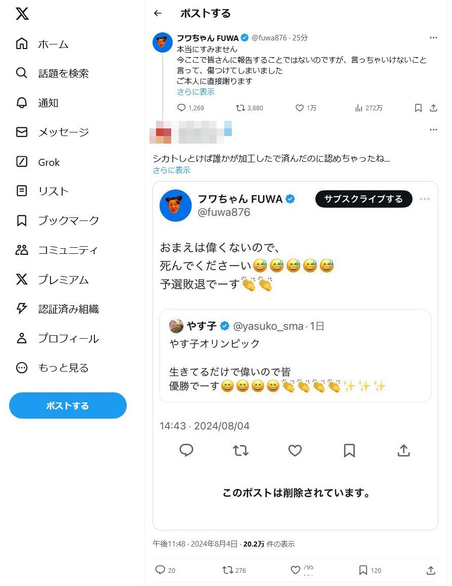 フワちゃんは4日に、お笑いタレント・やす子に対して誹謗(ひぼう)中傷とも解釈できるポスト(現在、削除済み)をXに投稿がネット上で拡散されていた。この投稿に対して、やす子は同日夜に「とっても悲しい」と反応。その後、フワちゃんはXで、具体名は出さなかったものの、「言っちゃいけないこと言って、傷つけてしまいました 本人に直接謝ります」と謝罪していた。