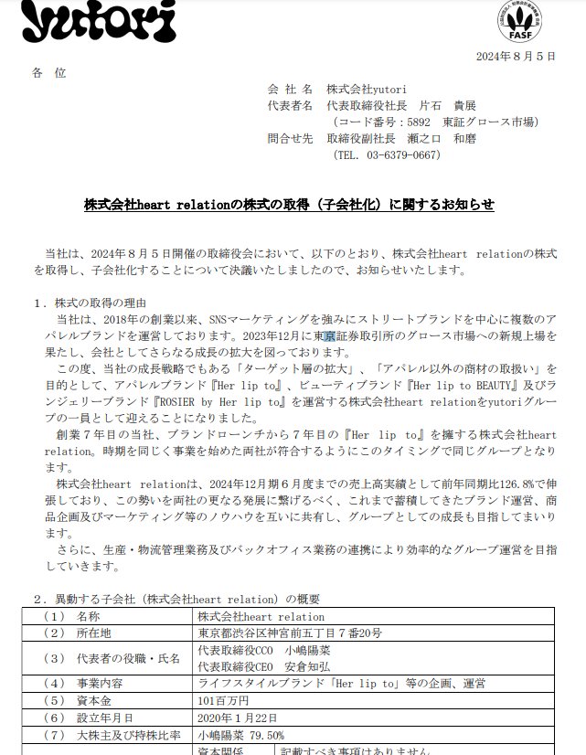 【速報】yutori(5892)、元AKBの小嶋陽菜(こじはる)率いるアパレルブランド「Her lip to」を買収。