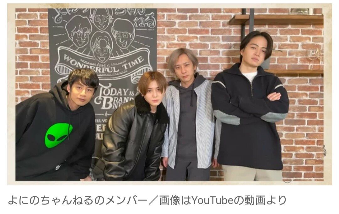 よにのちゃんねるは、嵐の二宮和也さん、KAT-TUNの中丸雄一さん、Hey! Say! JUMPの山田涼介さん、timelesz(旧Sexy Zone)の菊池風磨さんによるYouTubeチャンネル。