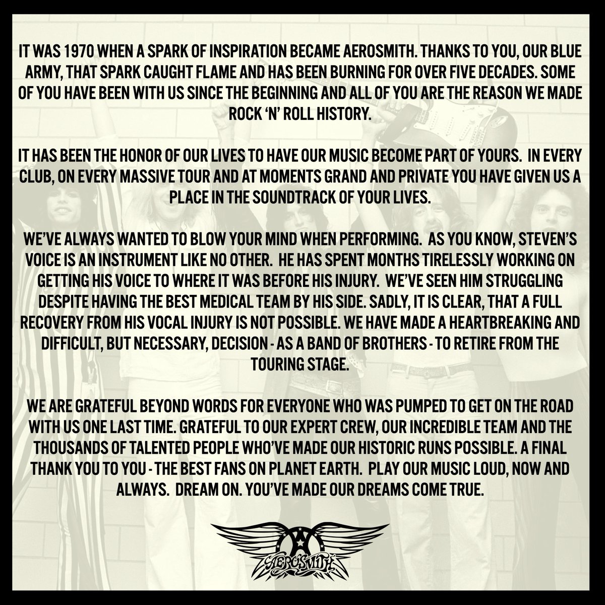 エアロスミスは、正式にツアーから引退することを金曜日にソーシャルメディア上の大規模な声明で発表した。スティーブン・タイラーが昨年負ったヴォーカルの怪我から回復するのに苦労しているため、お別れツアーとなるはずだった残りのツアーをキャンセルした。