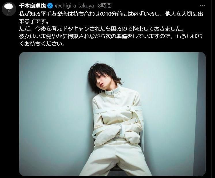 千木良氏はXで、平手を縛り付けた写真を掲載。「私が知る平手友梨奈は待ち合わせの10分前には必ずいるし、他人を大切に出来る子です」とした上で、「ただ、今後を考えドタキャンされたら困るので拘束しておきました」と伝えた。
