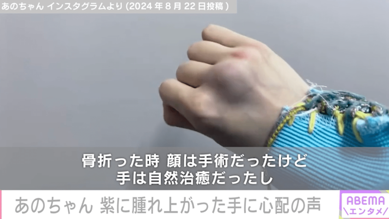 この投稿にネット上では、「あのちゃん…手、酷使のレベルじゃないな…どう使ったらそうなるんだ…?」「あのちゃん手大丈夫!!!ケンカダコじゃないよね?」「手大丈夫なの…あのちゃん」「大きい病院で検査してもらいなよ。」など、心配の声が寄せられている。(『ABEMA NEWS』より)