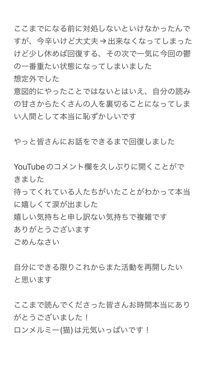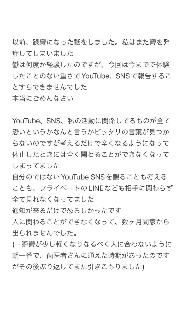 「YouTube、SNS、私の活動に関係してるものが全て恐いというかなんと言うかピッタリの言葉が見つからないのですが考えるだけで辛くなるようになって休止したときには全く関わることができなくなってしまってました 自分のではない YouTube SNSを観ることも考えることも、プライベートのLINEなども相手に関わらず全て見れなくなってました 通知が来るだけで恐ろしかったです人に関わることができなくなって、数ヶ月間家から出られませんでした」