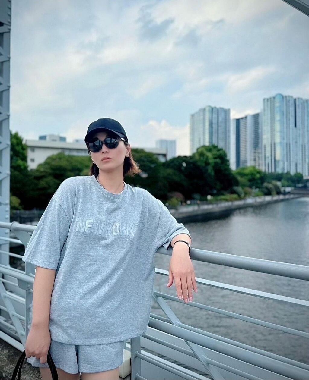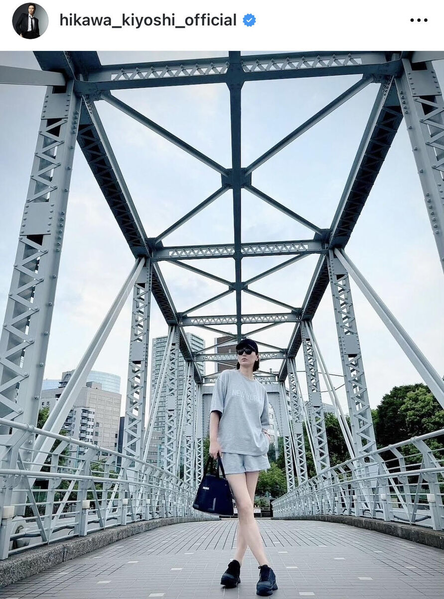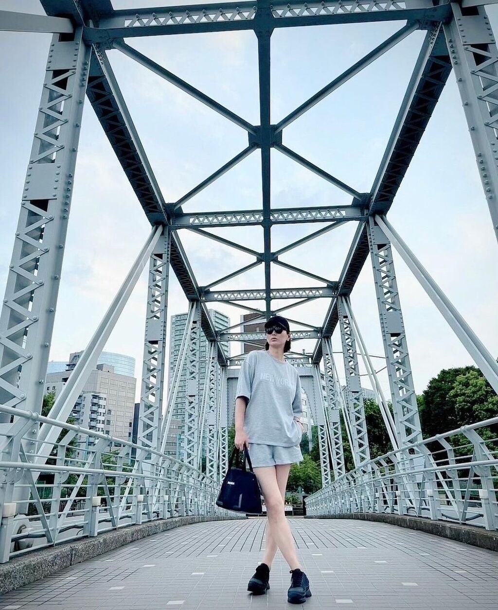 さらに「昨日、散歩しました。www」というコメントを添え、橋の上での全身ショットを公開。グレーのTシャツとショートパンツを着用し、美しい脚を惜しげなく披露している。