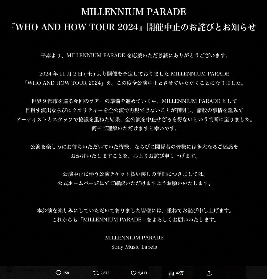 公式Xでは書面が投稿され、「2024年11月2日(土)より開催を予定しておりました『MILLENNIUM PARADE "WHO AND HOW TOUR 2024』を、この度全公演中止とさせていただくことになりました」と発表。