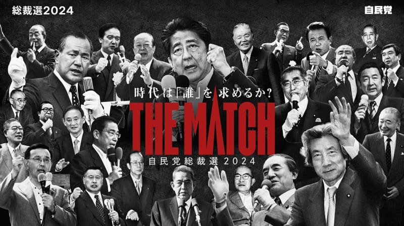 東国原氏は「THE MATCH」と銘打った自民党総裁選のポスターを貼付。ポスターには安倍晋三氏、田中角栄氏、小泉純一郎氏ら歴代の自民党総裁が写っている。