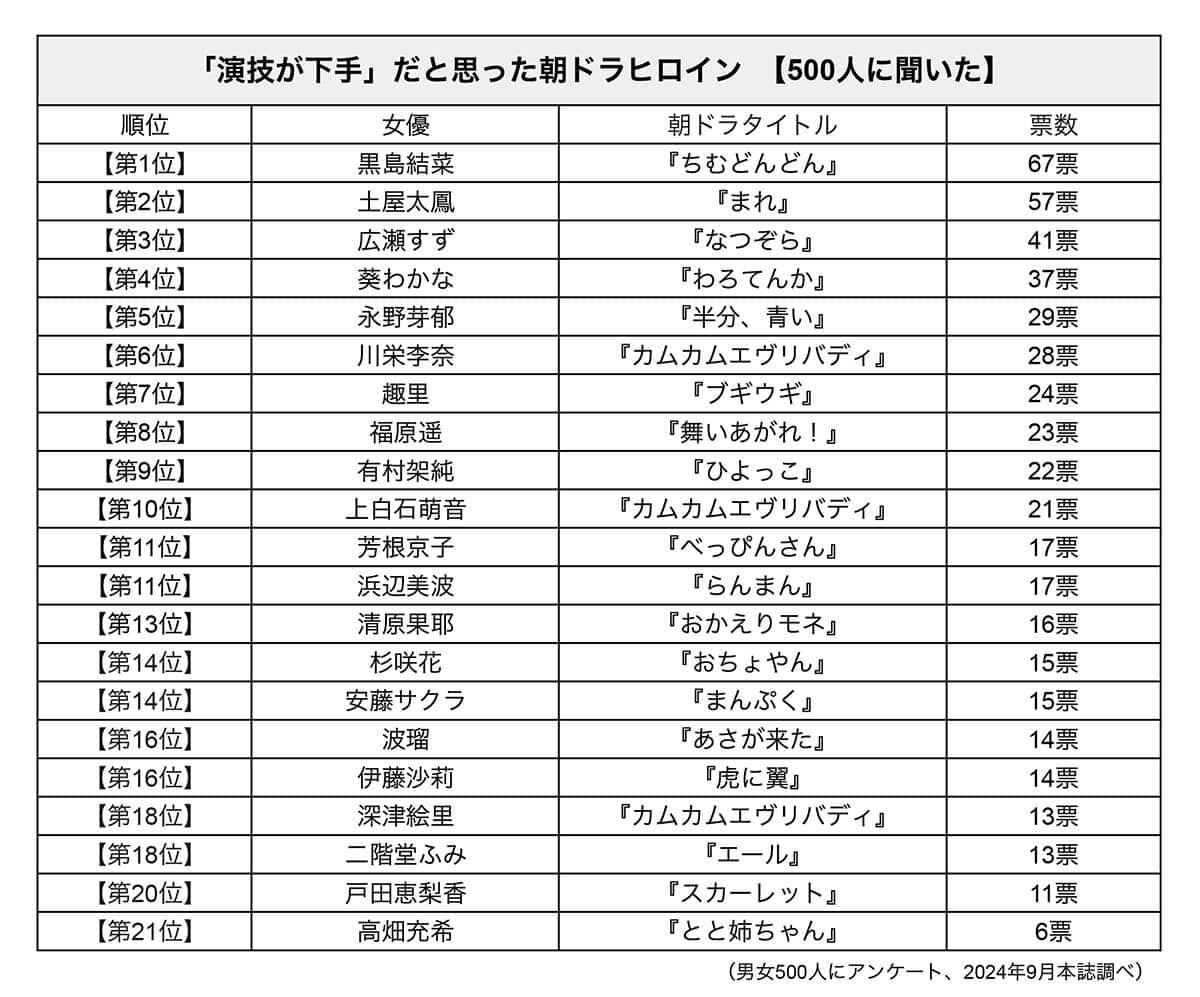 いっぽう、これまで朝ドラヒロインを演じてきた女優たちのなかには、演技力に厳しい声が寄せられた人も。そこで、本誌は全国の男女500人にアンケート調査を実施。過去10年で放送された朝ドラ作品のなかで、「演技が下手」だと感じた女優を1人選んでもらったところ、以下のような結果となった。