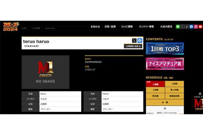 M-1公式のコンビのプロフィルに記されている、いくつものポイントが重なるのだ。「teruo haruo」はダウンタウンのかつてのコンビ名「てるお・はるお」と一致。出身の兵庫県も2人と一致。結成年の「2022年4月3日」は、吉本興業の特別公演『伝説の一日』で2人がセンターマイクの前でアドリブ漫才を披露した日と一致する。