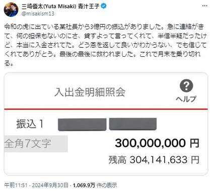 青汁王子の三崎優太、3億円の振り込みに感謝 明細画像を公開「某社長から急に連絡がきて…」 [冬月記者★]