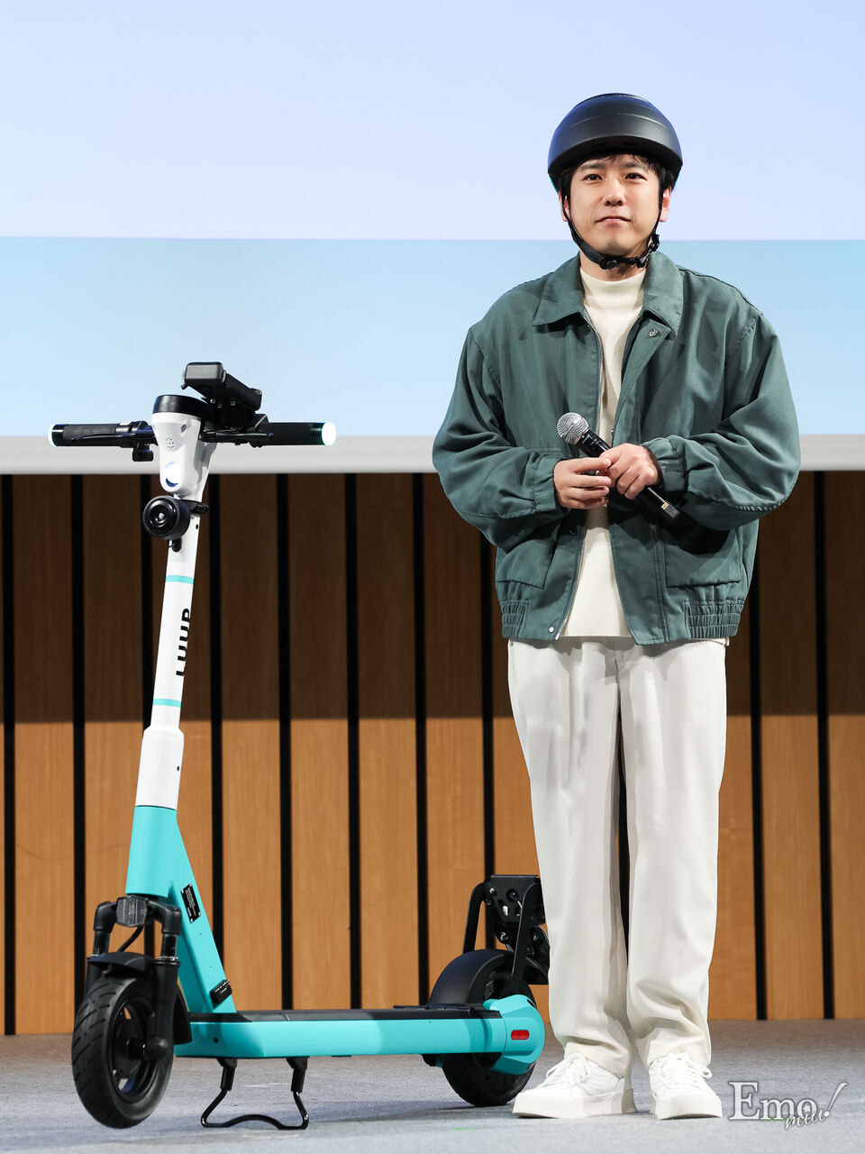 電動のキックボードに乗りヘルメット姿で現れた二宮は、普段からLUUPを愛用しているという。会見では「生活の中の1つの選択肢。どこか行こう、何かしようと思ったときに近くに(LUUPが)あるかなって考えます」と話した。