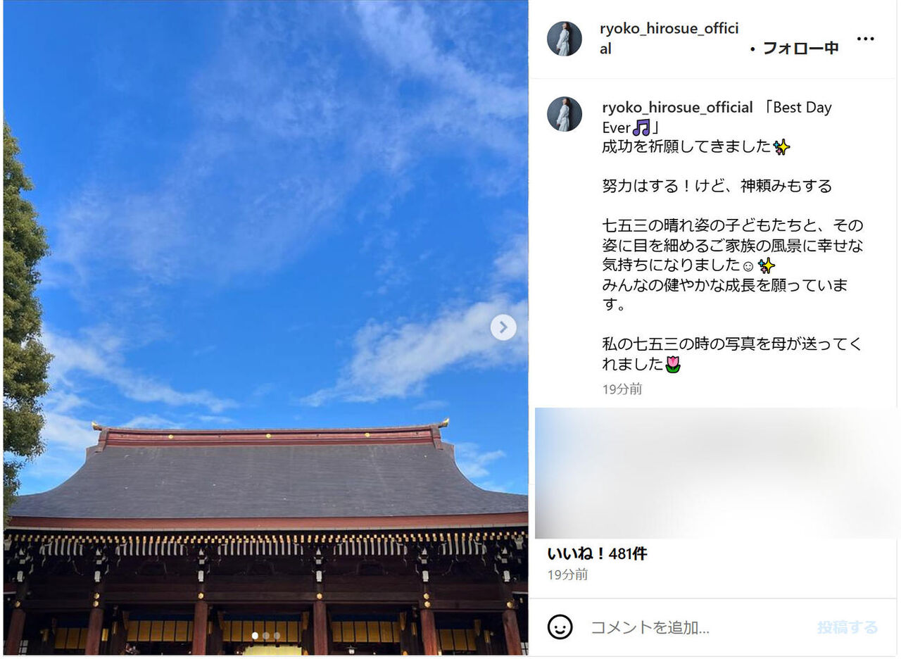 女優広末涼子(44)が16日、インスタグラムを更新。自身の「七五三」写真を公開した。